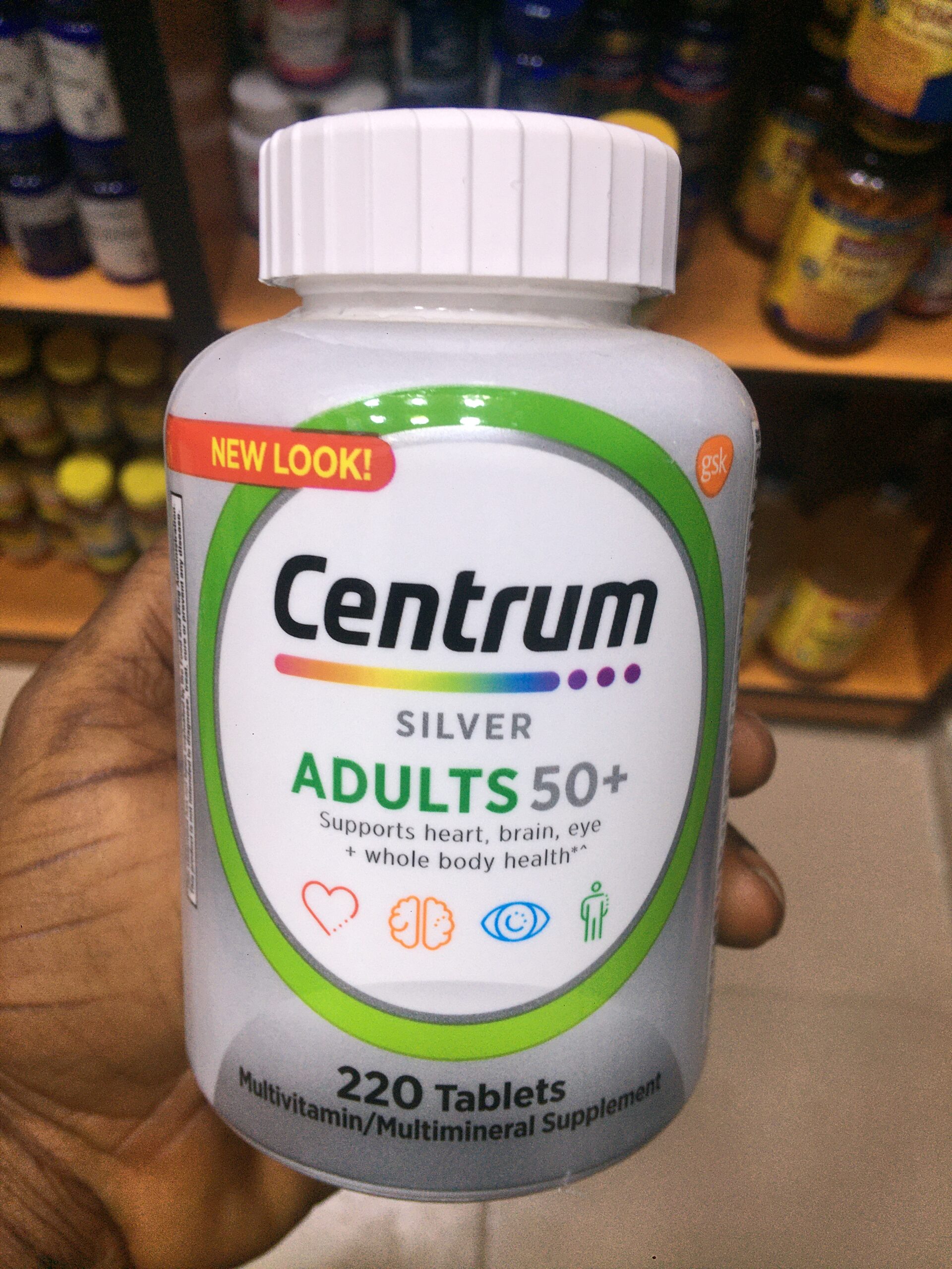One 220 count bottle of Centrum Silver Multivitamin for Adults 50 Plus, Multivitamin/Multimineral Supplement with Vitamin D3, B Vitamins and Calcium A multivitamin tailored to men and women 50 plus that helps support the heart, brain, eyes and overall health of adults age 50+ (1, 2) Adult multivitamin to help support full body wellness (1) Adult multivitamins for seniors contain B Vitamins and lycopene to help promote heart health, and Vitamins C and E and zinc to help support immune health, Vitamin D to support bone health and muscle function (1, 2) Multivitamins that are Non-GMO and gluten free (3) Multivitamin supplement that comes in an easy-to-swallow tablet Take one supplement tablet every day to provide nutrients to help support a healthy body Call